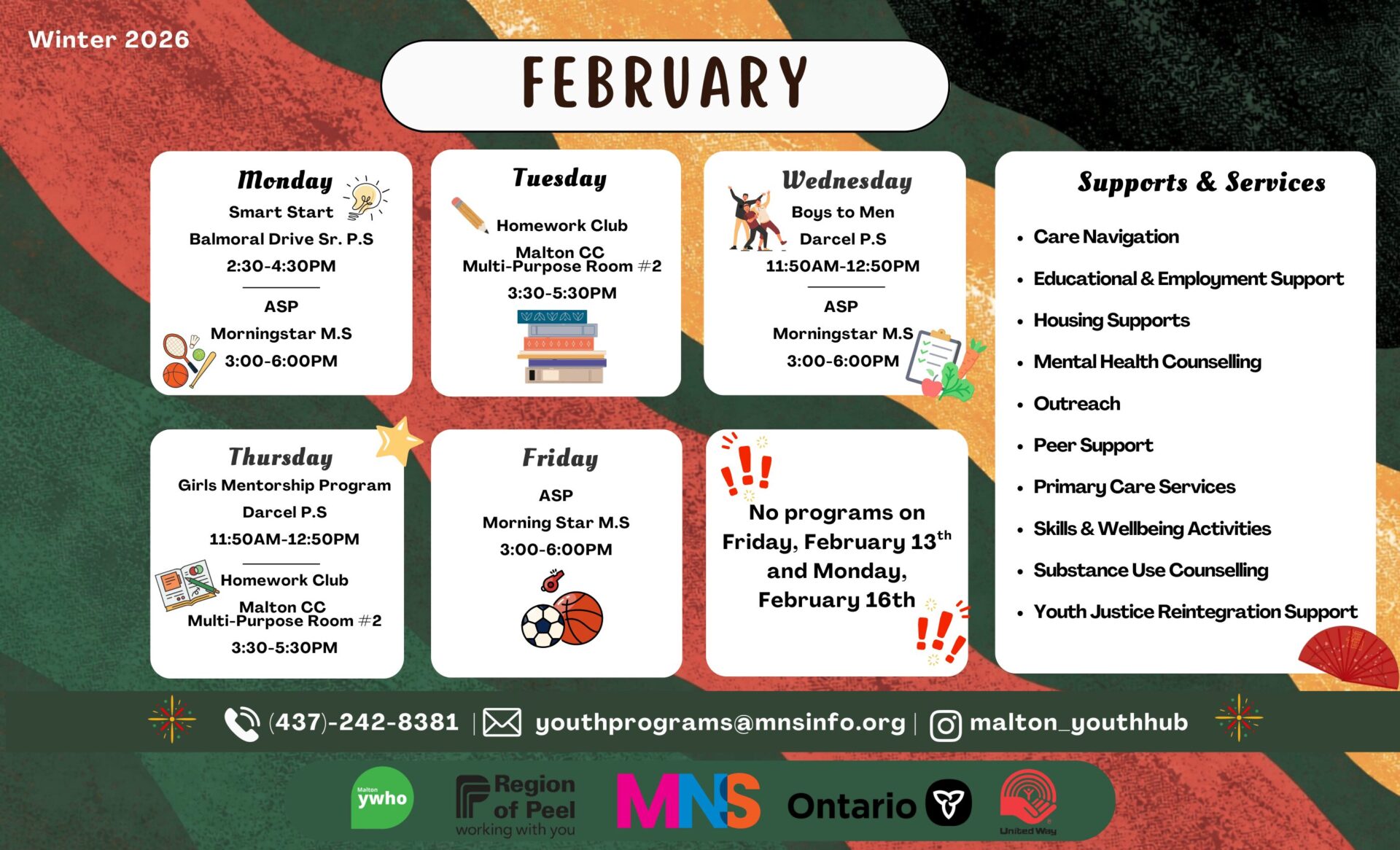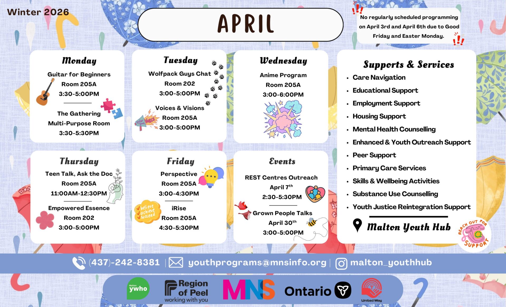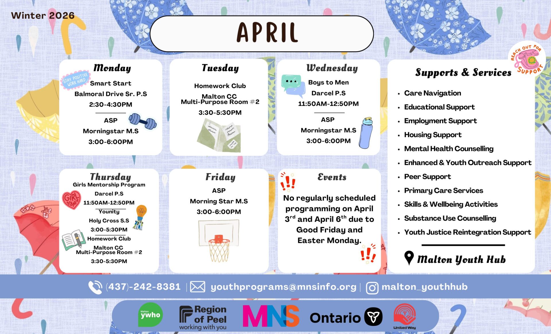 With the goal of removing barriers to the access of support for youth in our community, My Neighbourhood Services offers wrap-around service delivery through our four youth programs to provide comprehensive youth-driven programming.